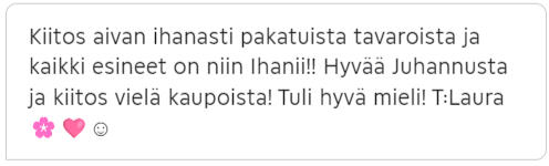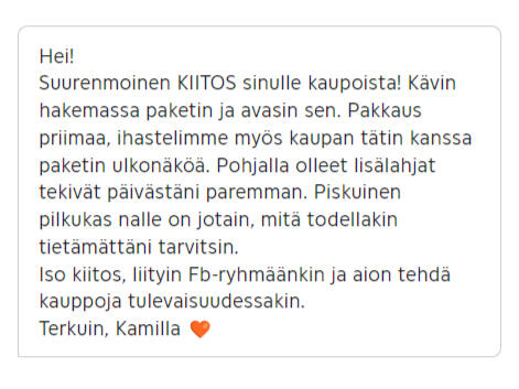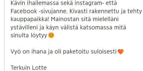 | ooMiten ostan?oo Ostaminen onnistuu lähettämällä meille viestiä Instagramissa tai Facebookissa. Kerro meille, mitä olet kiinnostunut ostamaan, ja sovitaan maksusta ja postituksesta tai noudosta. Maksu onnistuu tilisiirtona, Mobilepay-maksuna, Paypal-maksuna tai käteisellä noudon yhteydessä. |